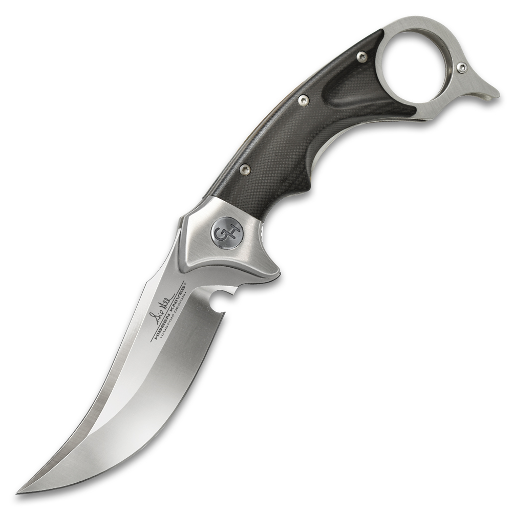 Experience the innovation of the Gil Hibben Folding Recurve Karambit. Say goodbye to the days of shortened, stubby blades on folding karambits! Our patented blade cover (US Patent No. 11,524,421) ensures that you can utilize the entire length of your karambit blade safely and effectively. Thanks to the ball bearing washer system and blade flipper, you can easily deploy the blade with just one hand, making it perfect for quick and seamless access. The 3 3/8-inch blade is constructed from high-quality 7Cr17 stainless steel with a satin finish, guaranteeing exceptional sharpness and durability for all your cutting needs. The blade screw is CNC machined with GH for the Gil Hibben brand, adding a touch of sophistication. Complementing the sleek blade, the stainless steel bolster features a matching satin finish, enhancing the knife's overall aesthetics and durability. The black G10 handle scales offer a comfortable and secure grip, ensuring precise control during use.