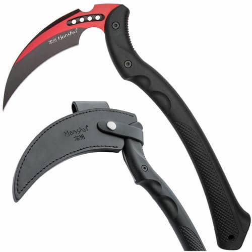 The Honshu Karito Kama is a modern reimagining of a battle-proven weapon, blending traditional design with cutting-edge materials for a formidable tactical tool. Inspired by the feudal-era kama, its 9” full-tang 7Cr13 stainless steel blade is curved for maximum cutting efficiency, with a 5 3/4” precision-honed edge and weight-reducing thru-holes for improved balance. This fusion of heritage and innovation makes the Karito Kama an exceptional addition to any collection. Built for superior grip and control, the injection-molded nylon handle features an EDM-textured surface and ergonomic finger grooves, ensuring a secure hold in any situation. A lanyard hole offers additional carry options, while the included premium black leather sheath provides secure storage with its belt loop and snap strap closure. At 15 3/4” overall, the Karito Kama is an exceptional blend of history and functionality, perfect for both display and tactical applications. For collectors and enthusiasts, this weapon is