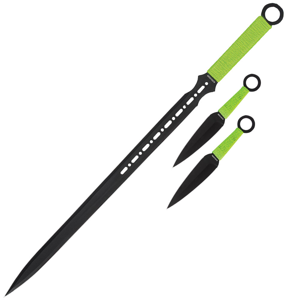 Tackle your foe whether big or small with this Black Legion Sword & Throwing Knife Set! Both throwing knives and the sword feature rock solid, one-piece stainless steel construction with razor-sharp blade edges. All three pieces have a non-reflective black coating, making them perfect for discreet missions. Green cord wrappings accent the handles, and the set is housed in a nylon sheath with shoulder sling.