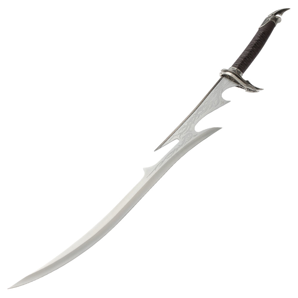 The latest in the Swords of the Ancients(tm) collection! Vorenthul is one of the three swords of Avonthia. The Avonthians were three brothers, sons of a king in ancient times, who were charged with imprisoning the deathless spirit of the Dark One in the depths of the earth (from the Swords of the Ancients mythology). The Samurai style hilt is fitted with a double guard, a tightly wrapped genuine leather grip, and a hooked and pointed pommel spike. The Elven style stainless steel blade is adorned with a deep etched flame design and a laser engraved Kit Rae emblem. Serial numbered and strictly limited to 2000 pieces worldwide! Includes a custom art print hand-signed by Kit Rae, and a certificate of authenticity. 29" blade. 42 1/2" overall.